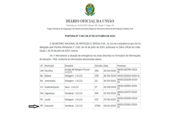 O Ministério da Integração e do Desenvolvimento Regional homologou o decreto de situação de emergência em Cascavel. O Diário Oficial da União publicou nesta segunda-feira (30) a Portaria Nº 3.367 reconhecendo a situação de emergência em Cascavel por conta do tornado que atingiu parte da cidade no dia 4 de outubro.