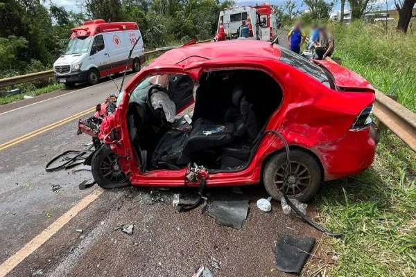 Corbélia, PR - Na tarde desta quarta-feira (01/01) um gravíssimo acidente ocorreu na BR-369, próximo a Corbélia, deixando uma pessoa presa nas ferragens. O incidente, que resultou em uma colisão frontal, envolveu um Voyage com placas da Argentina, que seguia no sentido Ubiratã, e um Lancer de Seara, Santa Catarina.