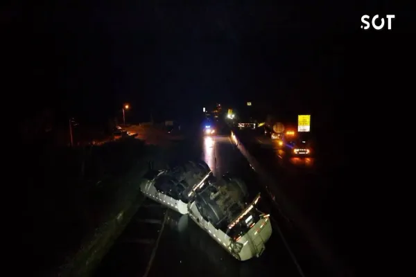 O acidente aconteceu na noite de sábado (23), por volta das 19h30. O caminhão carregado de óleo vegetal trafegava no sentido litoral, quando o motorista perdeu o controle da direção e tombou sobre a via. O veículo atingiu um automóvel que seguia no sentido oposto.