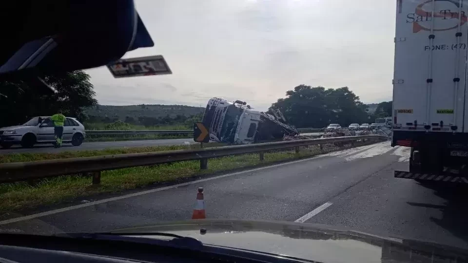 Segundo informações da Polícia Rodoviária Federal (PRF), o veículo tombou enquanto transportava uma carga de produto corrosivo, apresentando risco de inalação.