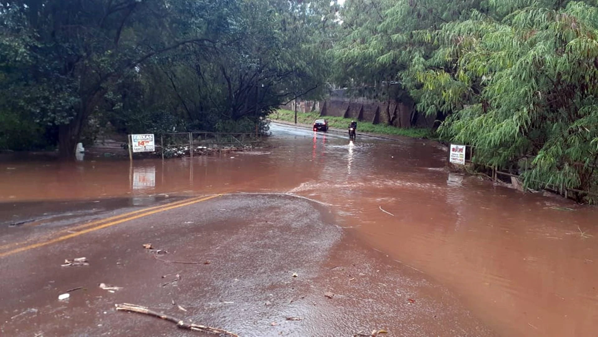 O trânsito no local ficou completamente interditado, pois o rio tomou conta da via, alguns automóveis se arriscavam tentando atravessar a rua.