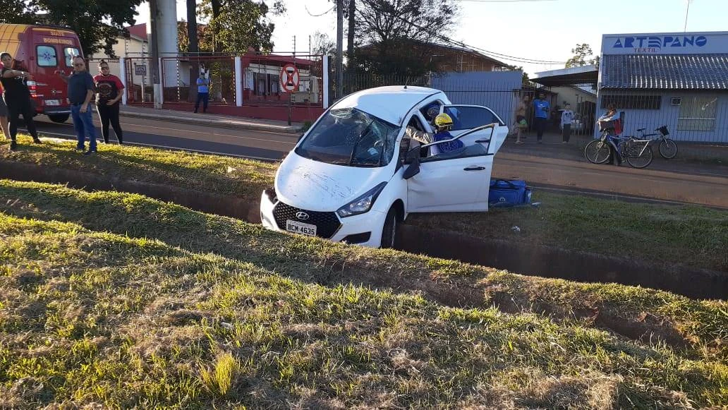 O automóvel Hunday HB20, acabou capotando diversas vezes após colidir contra um Fiat Palio, que acabou fugindo do local.