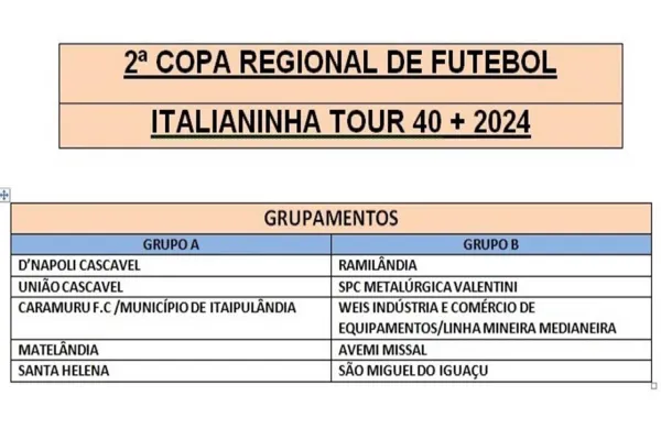 O Caramuru Futebol Clube representará o Município de Itaipulândia na 2º Copa Regional de Futebol Italianinha Tour classe 1984. A equipe garantiu sua participação ao vencer o campeonato municipal de campo categoria veteranos em 2023. A competição contará com a presença de 10 equipes de diferentes municípios, prometendo agitar a região com jogos de alto nível técnico.