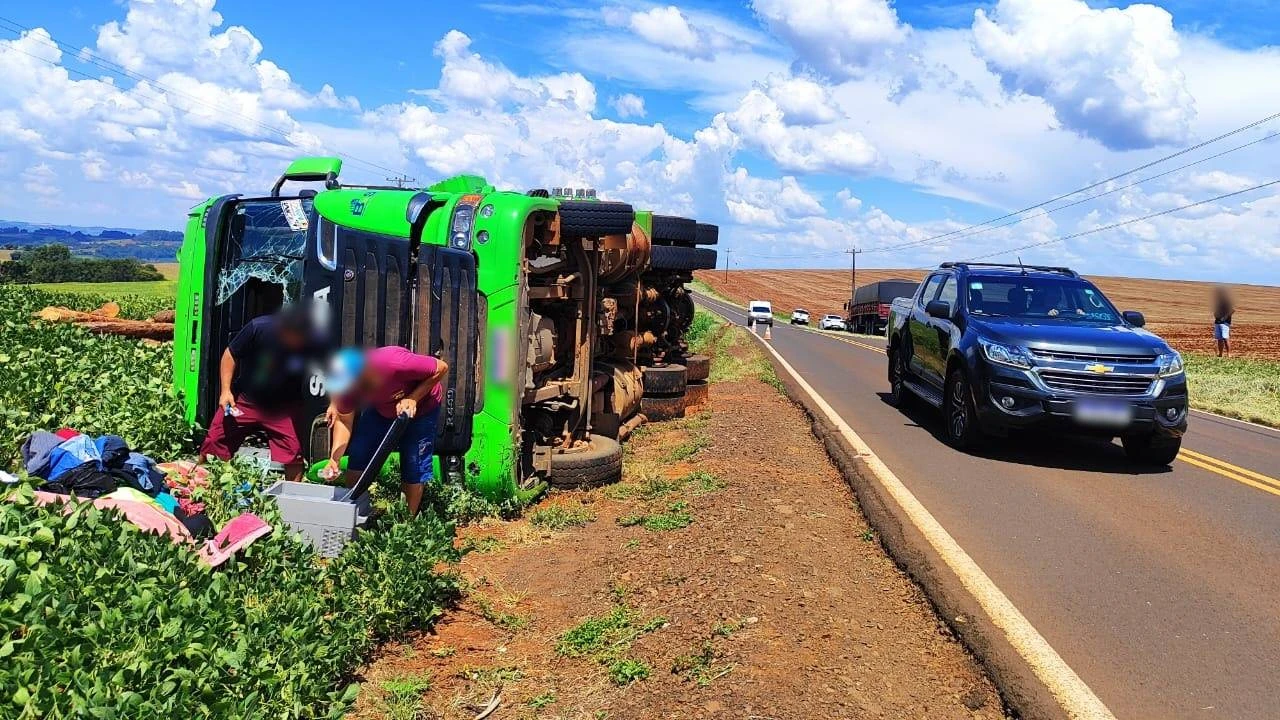 Para evitar uma colisão frontal com o veículo invadindo a pista, o condutor do bitrem teve que desviar para o acostamento, momento em que o veículo tombou, derrubando a carga na lavoura às margens da PR493.