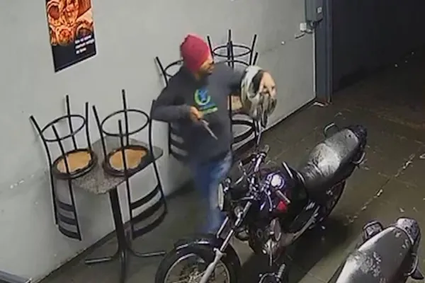 Imagens capturadas pelas câmeras de segurança de uma lanchonete no Bairro Coqueiral, em Cascavel, mostram o momento assustador em que um homem armado, usando moletom e gorro vermelho, invadiu o estabelecimento no final da noite de domingo (04).