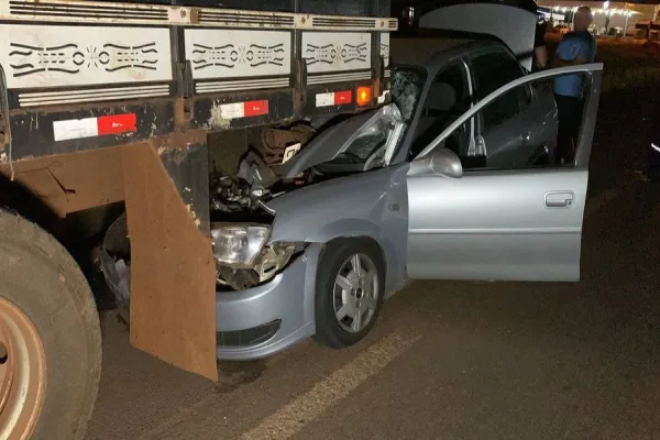 Carro para de baixo de caminhão após forte colisão na BR-277, no Bairro Santos Dumont em Cascavel