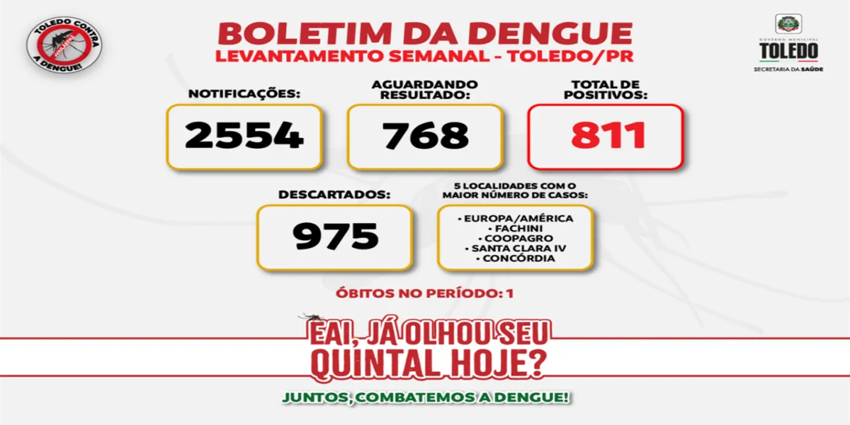 Combate - Para tentar conter o avanço da doença, a Prefeitura de Toledo tem realizado diversas ações, como Ecopontos Itinerantes, o último na região do Jardim Bressan e Cezar Park, intensificado campanhas de conscientização, averiguando imóveis denunciados, entre outros trabalhos. A preocupação, de acordo com a diretora de Vigilância em Saúde, Juliana Beux Konno, é que tradicionalmente, a explosão de casos acontece nos meses de março e abril.