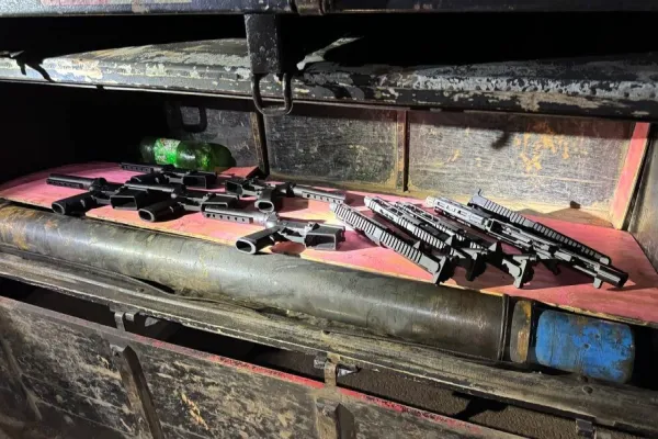 Após uma busca minuciosa no interior do veículo, os agentes encontraram escondidos debaixo da cama da cabine diversos tabletes de cocaína, totalizando um peso de 19 quilos da substância ilícita. Mas a surpresa não parou por aí: além da droga, foram descobertos também 10 fuzis de calibre 5.56 e uma pistola 9mm de origem estrangeira, indicando a gravidade do crime e a dimensão do esquema.