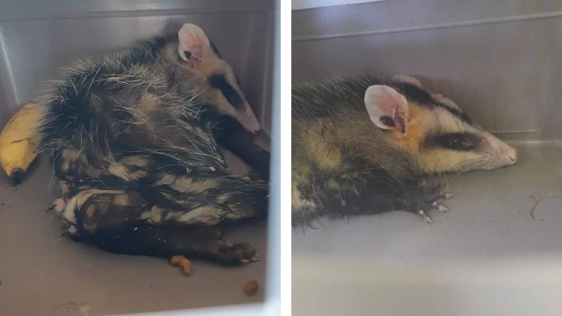 Os gambás estavam armazenados em gaiolas apropriadas para o transporte de animais, porém encontravam-se debilitados.