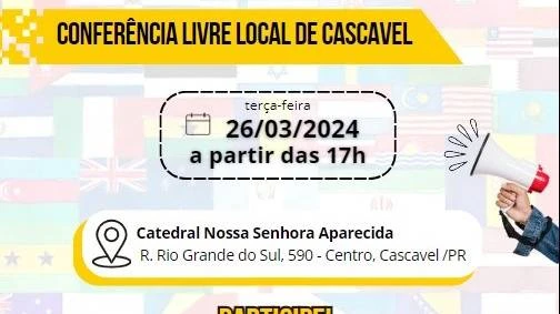 De maneira inédita, Cascavel realiza no dia 26 de março a 1ª Conferência Municipal de Migrações, Refúgio e Apatridia, evento que acontecerá na Catedral Nossa Senhora Aparecida, a partir das 17h.