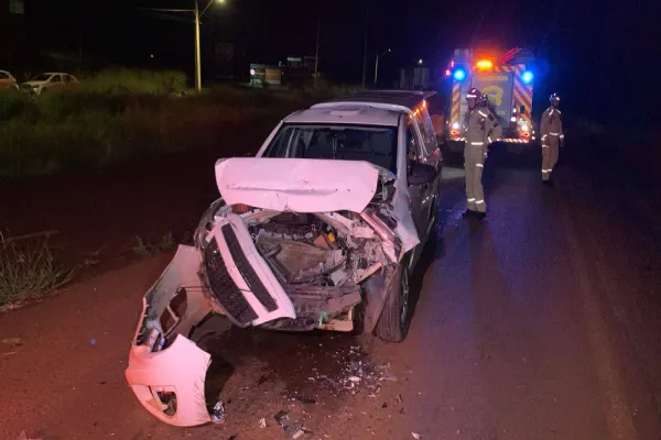 A colisão envolveu um veículo Montana e um caminhão guincho, porém, felizmente, não resultou em vítimas graves. Apesar do impacto, um casal que estava no veículo foi avaliado pela equipe médica no local.