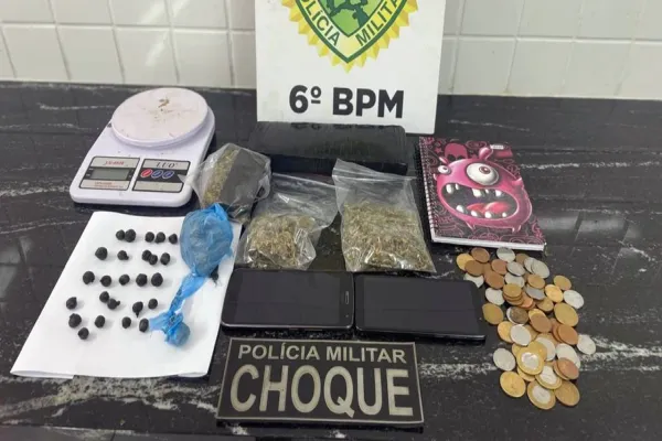 Com autorização para realizar buscas na residência, os policiais encontraram várias porções de maconha e um tablete da substância, totalizando 601 gramas. Além disso, foram apreendidos uma balança de precisão, 25 bolinhas de fumo com haxixe, um caderno com anotações do tráfico, dois celulares e uma quantia em moedas.