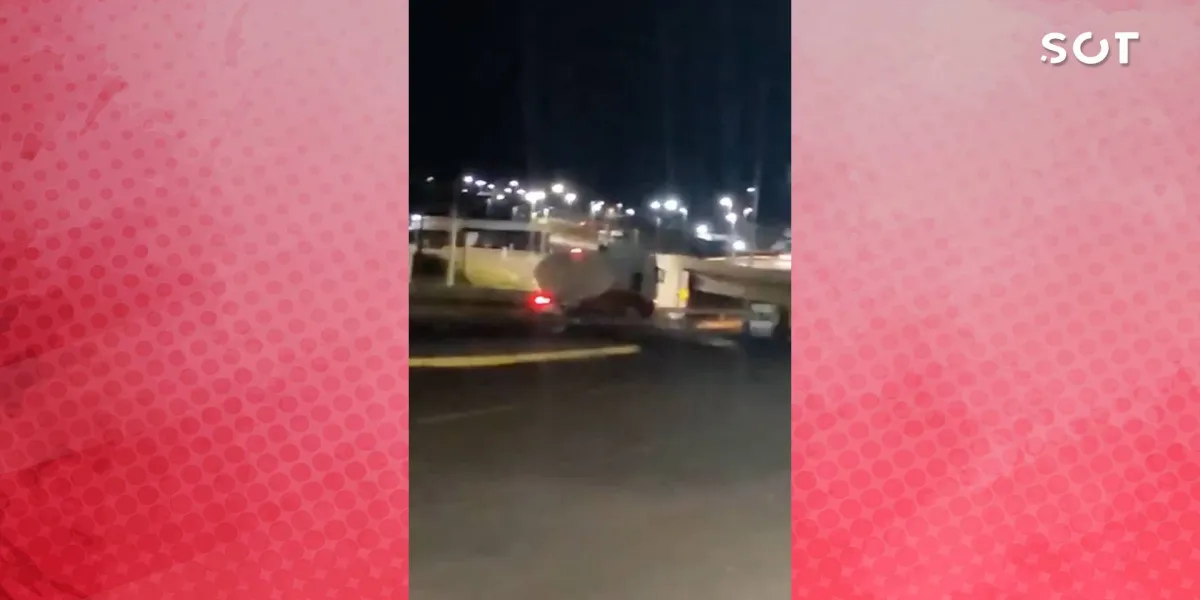 Vídeo registra o momento em que caminhão derruba postes no Trevo Cataratas em Cascavel
