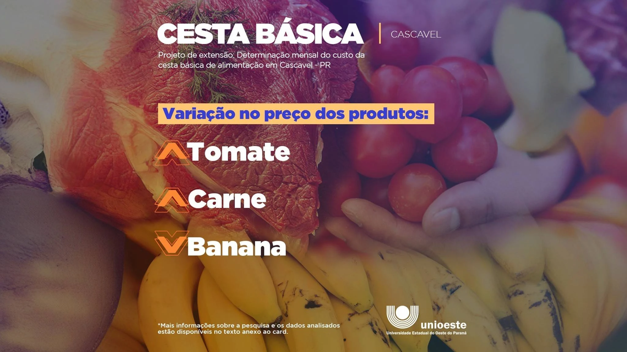 Uma pesquisa realizada mensalmente pelo projeto de extensão: Determinação mensal do custo da cesta básica de alimentação, que é afeto ao curso de Ciências Econômicas da Universidade Estadual do Oeste do Paraná (Unioeste), campus Cascavel, aponta um aumento de 3,42% no valor da cesta básica de alimentos no mês de março, passando de R$613,52 para R$634,50.
