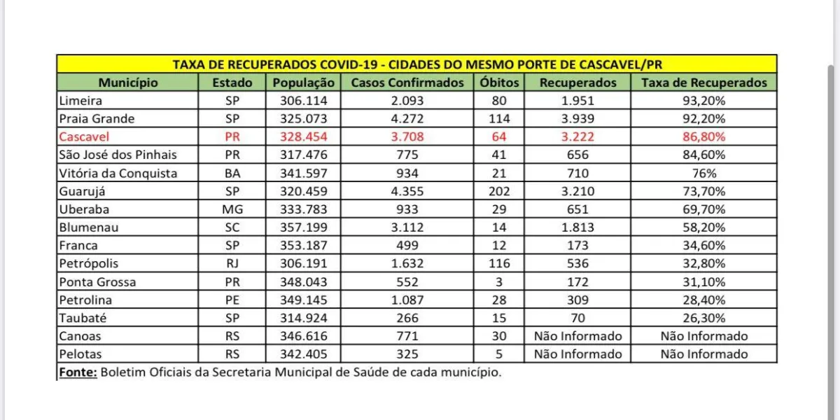 Em um informativo que consta os dados de municípios de diferentes estados brasileiros e com o número de habitantes semelhante aos do município de Cascavel, a taxa de letalidade mostra-se inferior a 4,1%, considerada pelo Ministério de Saúde como a média nacional.