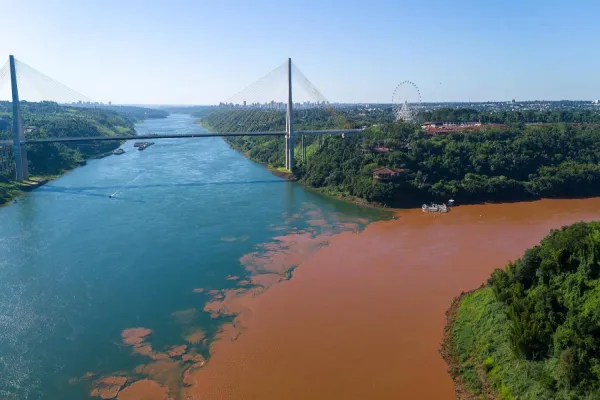 Em um espetáculo natural único, os rios Iguaçu e Paraná se encontram na região do Marco das Três Fronteiras, criando um contraste de cores que impressiona a todos que o presenciam.