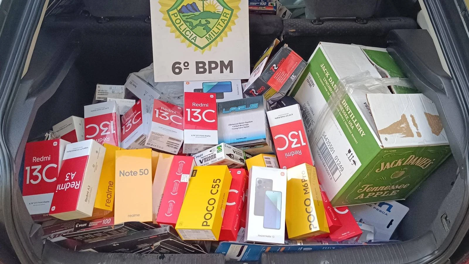 Os ocupantes do veículo informaram que o valor total das mercadorias era de aproximadamente R$ 200 mil. Entre os itens apreendidos estavam 35 aparelhos de celular, diversos produtos de pesca, 30 galões de azeite de oliva e outros eletrônicos.