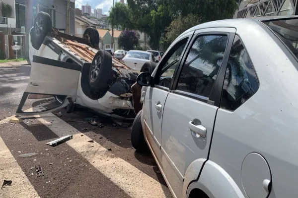 Duster capota após forte colisão de trânsito com Fiesta na Rua Manoel Ribas no centro de Cascavel