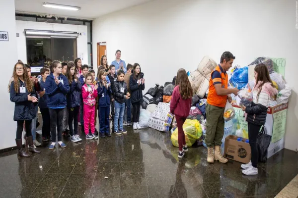 Entre uma visita e outra, fizeram uma pausa para realizarem a entrega simbólica dos donativos ao Rio Grande do Sul recolhidos na Câmara para o coordenador da Defesa Civil, Márcio Ribeiro, com a participação dos vereadores Cidão da Telepar (Podemos) e Melo do Pastel (PL). De volta ao Plenário, um receberam uma atividade para casa, que é desenhar qual o espaço que mais gostaram na Câmara.