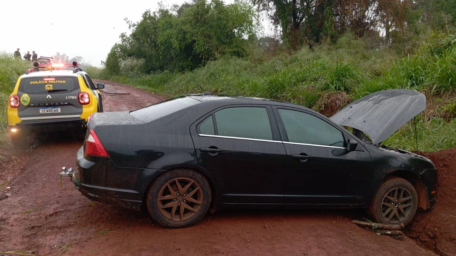 Ao atender a ocorrência, os policiais constataram que o veículo estava com o chassi parcialmente raspado e batido em um barranco, atolado em uma valeta. Apesar da falta das placas, foi possível identificar, através do número parcial do chassi, que se tratava do carro furtado em Toledo.