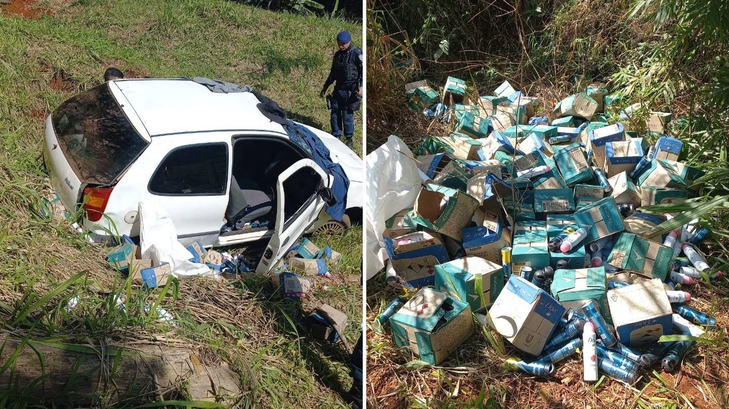 Segundo informações, o carro, que estava carregado com uma grande quantidade de desodorantes, era conduzido por um indivíduo que, após o capotamento, fugiu do local sem deixar pistas.