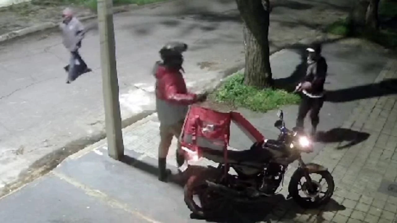 No vídeo, o entregador estaciona sua moto em frente a um endereço para realizar uma entrega. Ao sair do veículo, ele é abordado por dois indivíduos que se aproximam em atitude suspeita. Um deles o confronta na calçada, enquanto o outro permanece próximo à moto, aparentemente com a intenção de roubá-la.