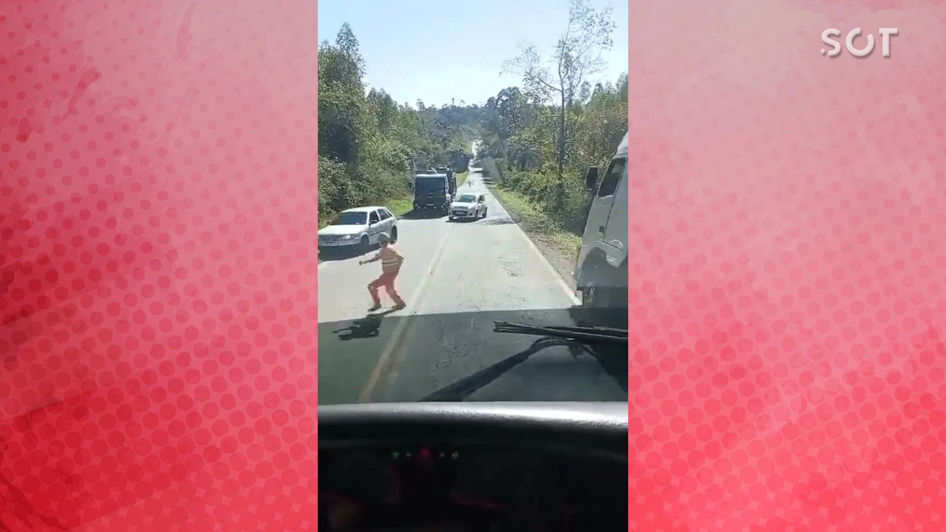 As imagens mostram o trabalhador da obra sinalizando a alteração no trânsito na rodovia de pista simples, durante uma operação de tapa-buracos. O caminhoneiro que filma a cena relata a ausência de sinalização metros antes do local da obra, dificultando a frenagem dos motoristas, especialmente em um trecho de descida.
