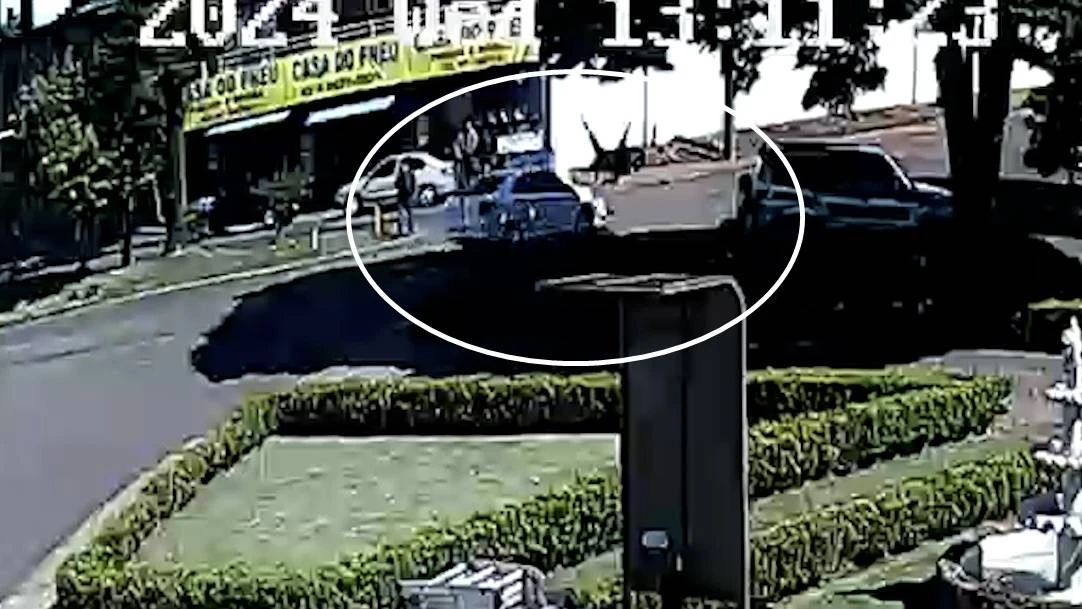 Uma câmera de segurança flagrou o momento do acidente. As imagens mostram o motociclista sendo arremessado após a batida. A dinâmica do acidente ainda está sendo apurada pela Polícia Militar.