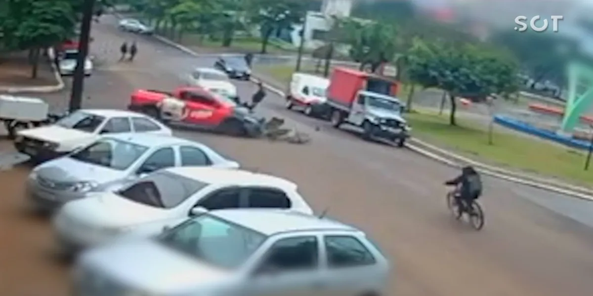 De acordo com as imagens, o ciclista, um adolescente, trafegava pela via quando foi atingido por um veículo que realizava um cruzamento. O impacto da colisão arremessou o jovem para longe.