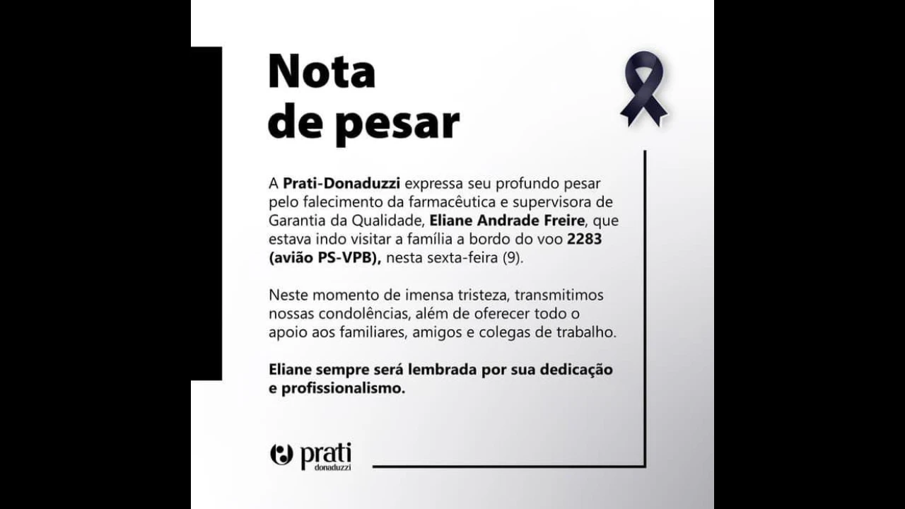 “A Prati-Donaduzzi expressa seu profundo pesar pelo falecimento da farmacêutica e supervisora de Garantia da Qualidade, Eliane Andrade Freire, que estava indo visitar a família a bordo do voo 2283 (avião PS-VPB), nesta sexta-feira (9).