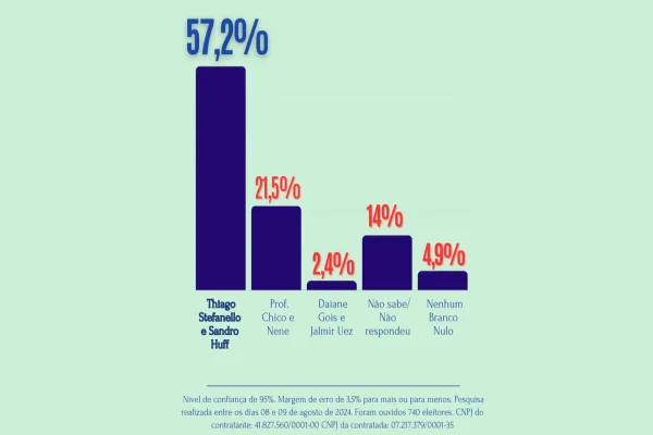 De acordo com a pesquisa, a chapa formada por Tiago Stefanello e seu vice Sandro Huff lidera com 57,2% das intenções de voto. Em seguida, aparecem Professor Chico/Nene com 21,5% e Daiane Gois/Jalmir Uez com 2,4%. Os eleitores que não souberam ou não responderam somam 14%, enquanto 4,9% declararam intenção de voto em branco, nulo ou em nenhum candidato.
