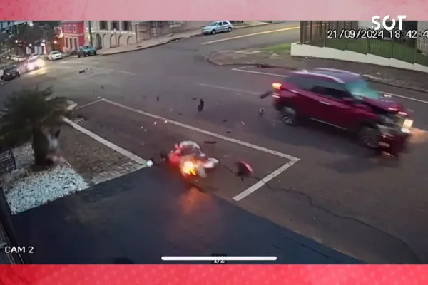 Uma câmera de monitoramento registrou o grave acidente de trânsito envolvendo um carro e uma moto na noite de sábado(21). O jovem de 23 anos acabou morrendo após o impacto.
