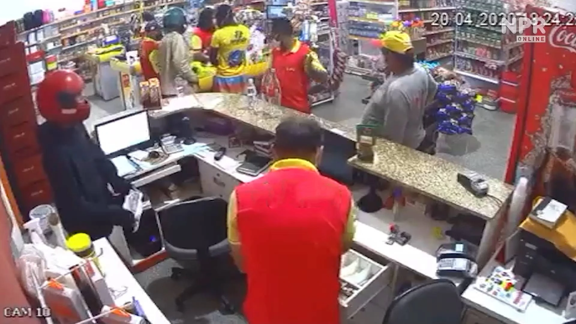 Dois indivíduos chegaram no local em uma moto, entrando rapidamente dentro comercio usando capacete...