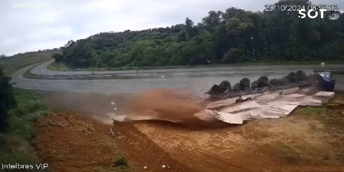Tibagi (PR) – Imagens de câmeras de segurança registraram o momento exato em que um caminhão carregado com chapas de MDF tombou ao realizar uma curva na BR-376, em Tibagi, na manhã deste domingo (20).