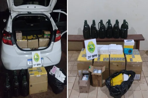 Diante da informação, os policiais militares se deslocaram até o local indicado e localizaram os veículos em questão. Após realizar a abordagem, os militares constataram que os veículos estavam carregados com diversos produtos de origem paraguaia, caracterizando o crime de descaminho.