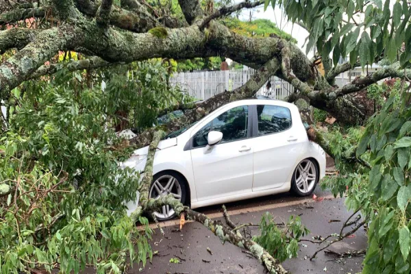 Árvore cai e destrói Peugeot em frente ao Detran, em Cascavel