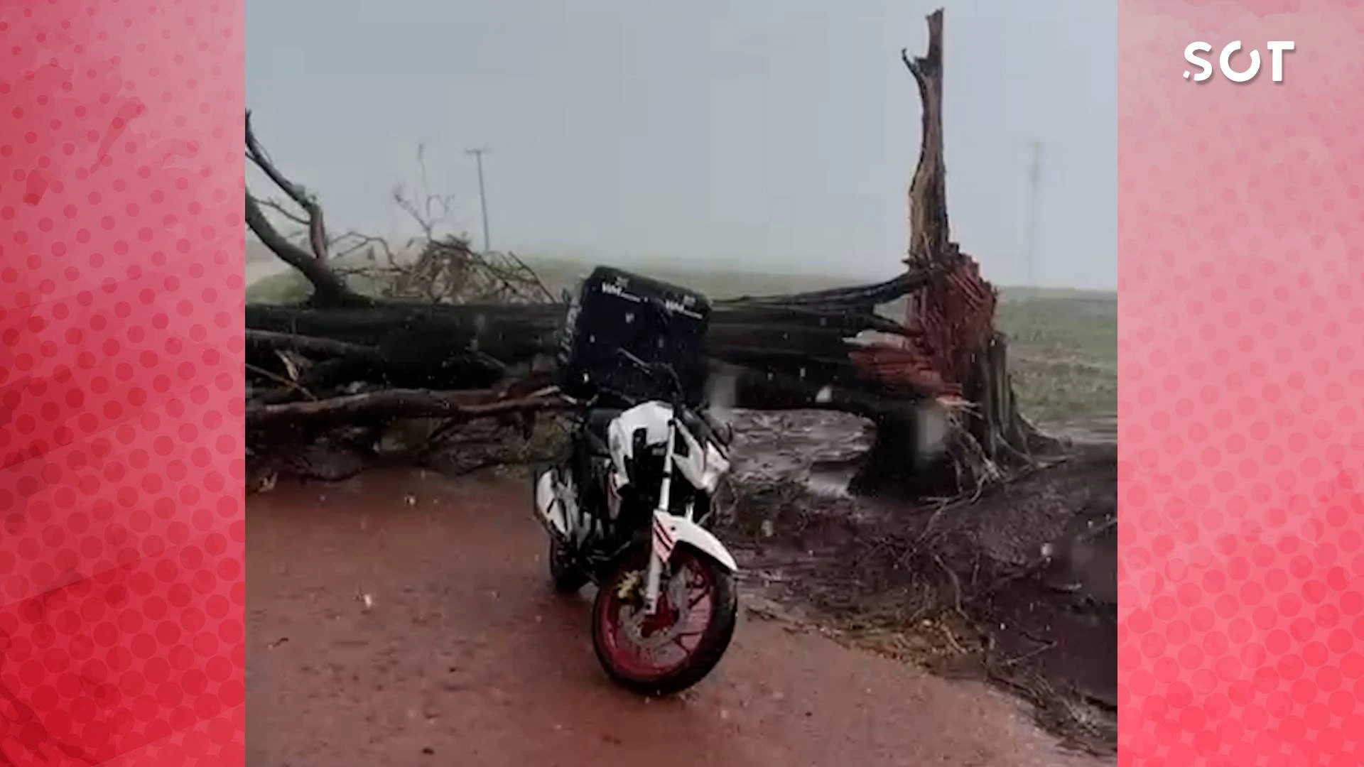 "O vento arrastou ela, moio tudo, o baú dentro, foi complicado o caso, a árvore ia cair em cima da moto, não sei se foi Deus que virou ela, porque tava muito chuva e na hora que eu vi que a árvore foi cair eu corri né, o murundum que tinha lá, aí a moto caiu, a moto já tinha caído. E a árvore quebrou e ia cair em cima da moto, mas Deus foi tão bom que ela virou o sentido pra cair", relatou Todynho (Express), o motociclista.
