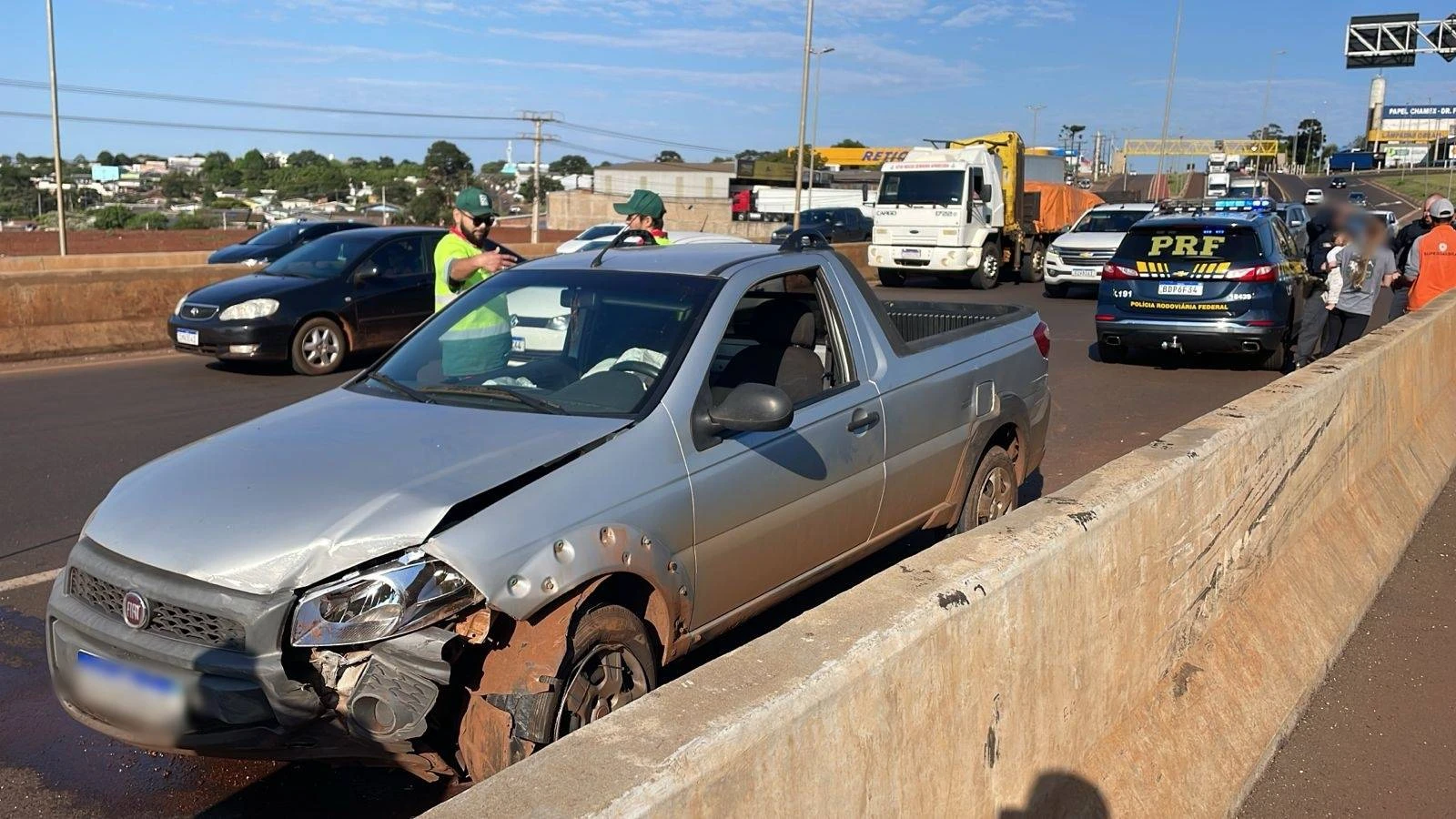 De acordo com informações preliminares, o impacto da batida projetou a Strada contra a mureta de proteção, fazendo com que o veículo capotasse. O airbag do automóvel foi acionado, mas felizmente não houve vítimas, apenas danos materiais.