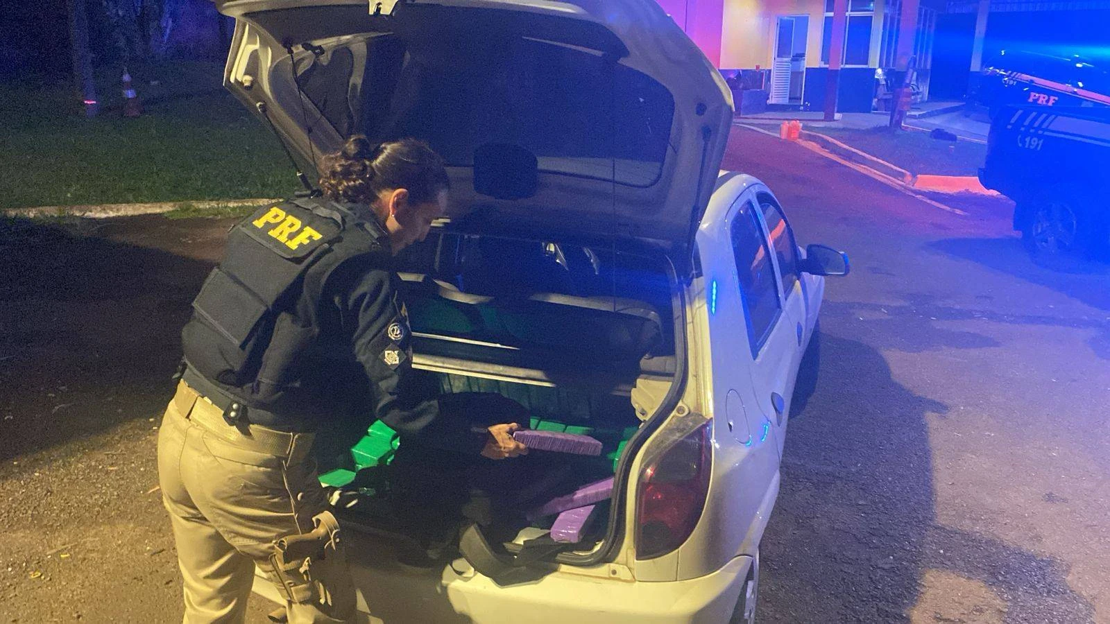 Às 23h57 de ontem, uma equipe da PRF deu ordem de parada ao motorista de um Chevrolet Celta. No carro estavam um homem e uma mulher, ambos com 19 anos de idade. Durante a fiscalização, os policiais encontraram diversos tabletes de maconha no interior do veículo e no porta-malas, pesando um total de 145,6 quilos da droga.