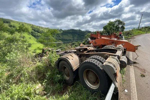 De acordo com informações, um caminhão que transportava uma retroescavadeira perdeu o controle após o estouro de um pneu traseiro do reboque, enquanto descia um declive. O veículo colidiu contra o guard-rail e tombou, caindo em um barranco às margens da rodovia.