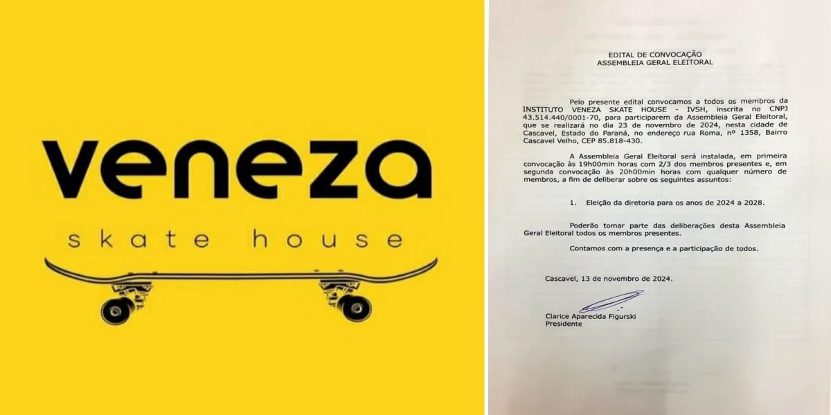 O Instituto Veneza Skate House anunciou a realização de sua assembleia eleitoral para a constituição da nova diretoria da entidade. O encontro está marcado para o dia 23 de novembro de 2024, às 20h, e será realizado na sede do instituto, localizada na Rua Roma, nº 1358, no bairro Cascavel Velho, em Cascavel (PR).