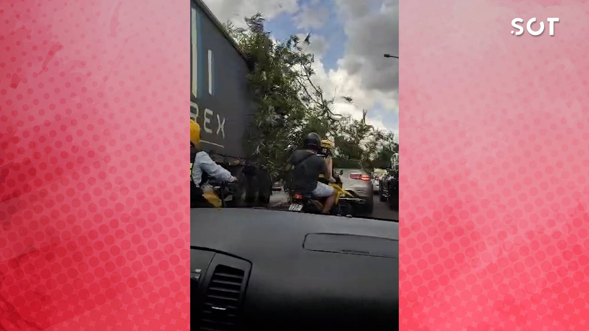 Galho de árvore cai de cima de caminhão atinge motociclistas na Ponte da Amizade; Veja o vídeo