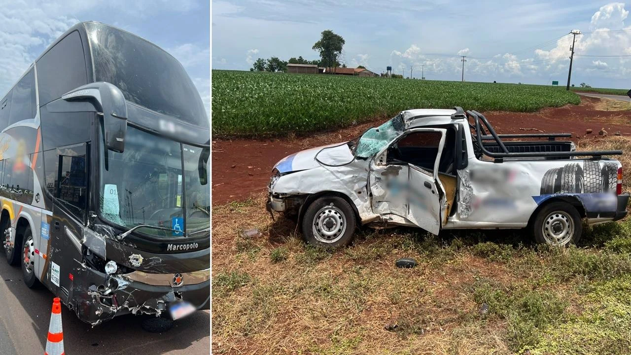 De acordo com informações da Polícia Rodoviária Estadual (PRE), o ônibus, um Volvo/Mpolo de placas JDP-8C22/SC, conduzido por um homem de 65 anos, seguia pela rodovia quando colidiu transversalmente com uma camioneta Ford/Corrier de placas ETW-6311/PR, que atravessava a via.