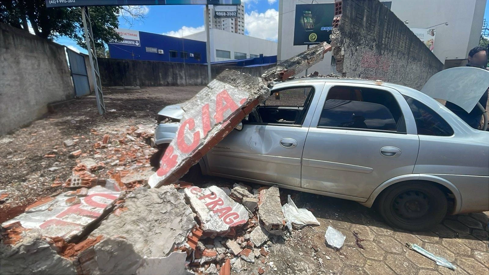 O carro, após a colisão, atingiu uma parede, causando danos significativos à estrutura do prédio. Imagens do local mostram tijolos caídos sobre o veículo.