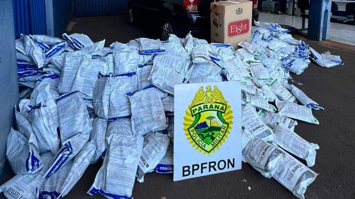 Durante patrulhamento de rotina, policiais militares do pelotão de operações com cães abordaram um veículo Volkswagen/Gol. Apesar de o condutor, de 31 anos, não apresentar irregularidades, a revista veicular revelou a carga ilícita: 408 kg de agrotóxicos e 50 pacotes de cigarros de origem estrangeira.