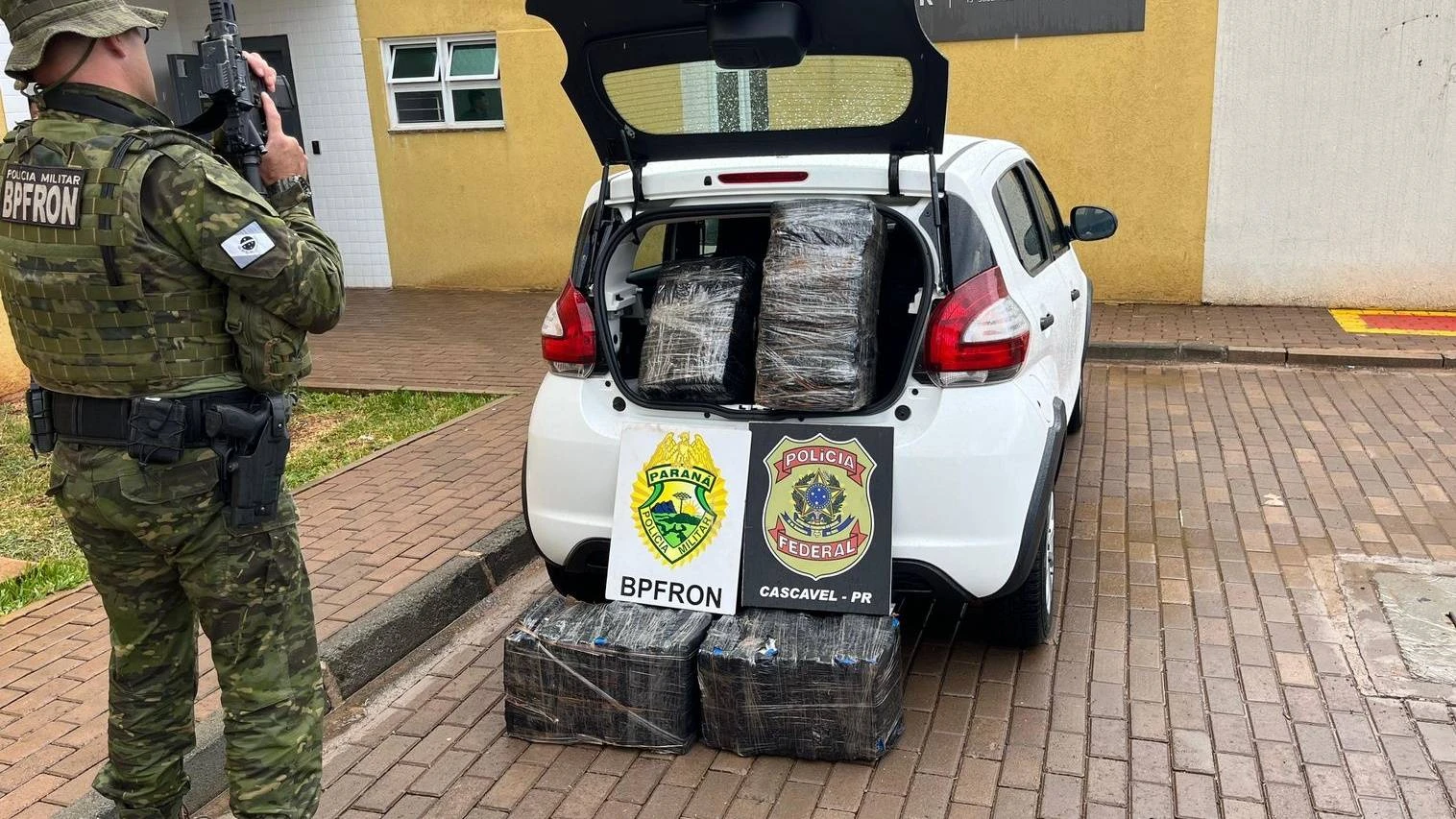 A apreensão ocorreu durante patrulhamento na BR 277, próximo ao antigo pedágio desativado de Céu Azul. Os policiais abordaram um Fiat/Mobi após o condutor demonstrar nervosismo. Durante a vistoria, foram encontrados quatro fardos da droga no porta-malas do veículo.