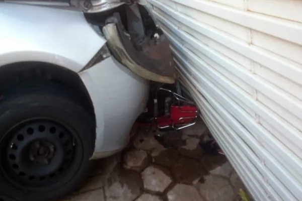 Com a força do impacto, veículo Gol acabou empurrando a moto e colidindo contra um portão. A motocicleta ainda ficou embaixo do carro.