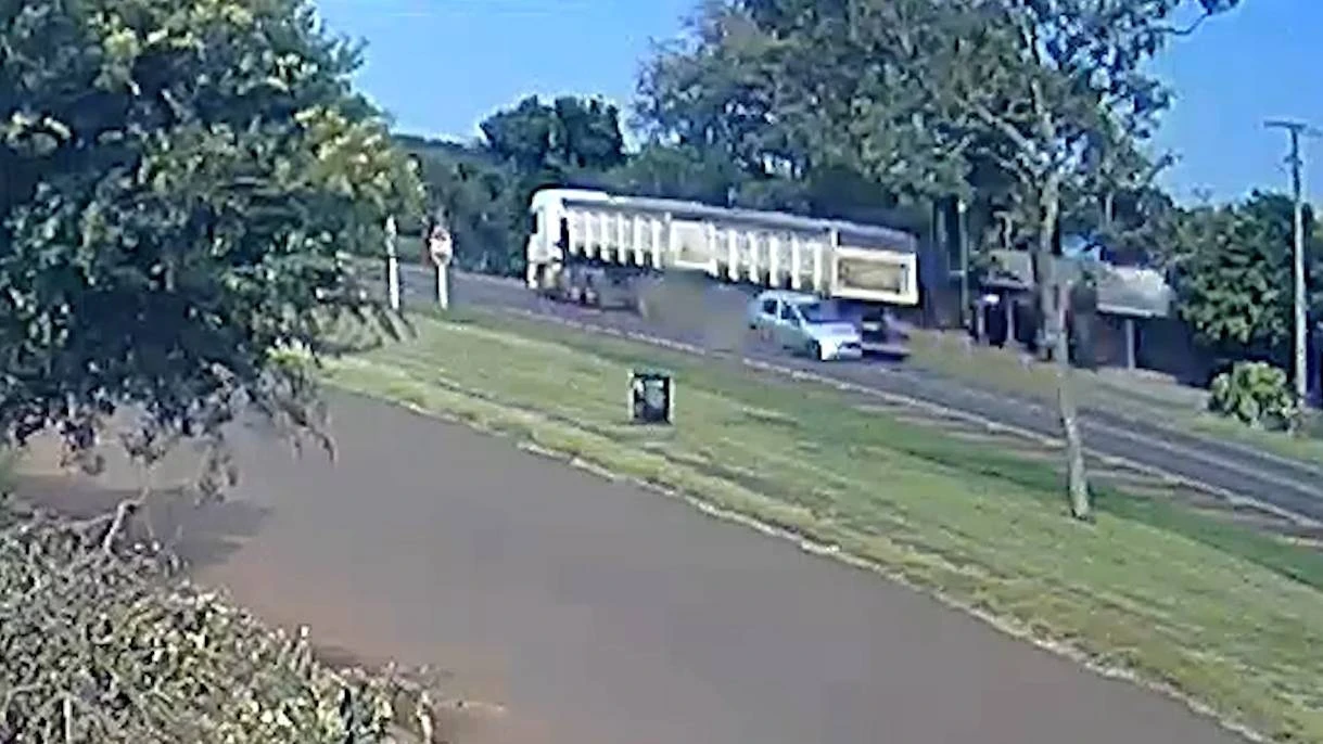 As imagens capturadas por uma câmera de segurança de uma residência próxima ao local do acidente mostram o momento do impacto. Os veículos, um Chevrolet Celta e um caminhão, seguiam em direções opostas e colidiram lateralmente no acesso à cidade.