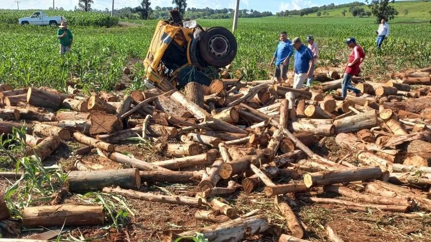 Na tarde desta segunda-feira (3), um grave acidente chocou a comunidade de Anahy, na região oeste do Paraná. Um caminhão carregado com toras de madeira perdeu o controle e capotou em uma lavoura inclinada, resultando na destruição completa do veículo.