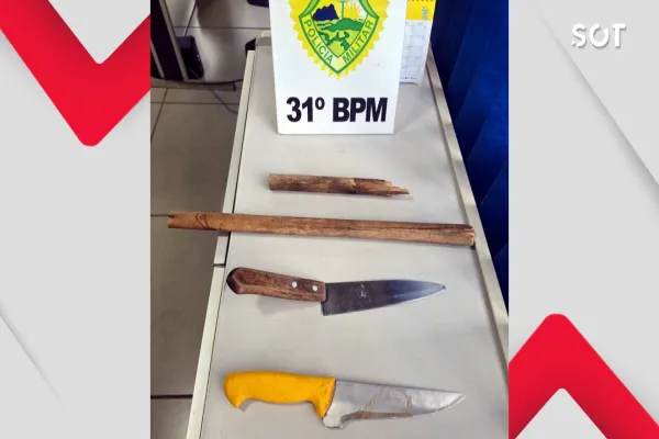 No local, os policiais encontraram o homem em posse de facas e um bastão de madeira. Foi constatado ainda que ele possuía uma medida protetiva em seu nome, da qual não tinha ciência.